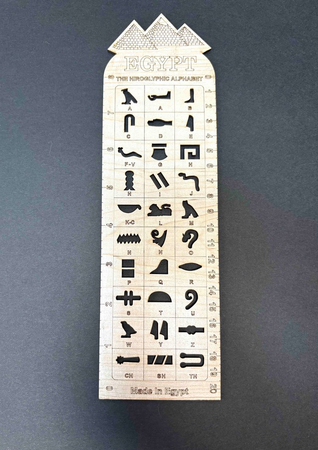 エジプトで仕入れたヒエログリフ定規です。 ギザのピラミッド、ファラオ、猫バージョンの3種類あります。 木製です。 ヒエログリフを描けるプレートになっています。